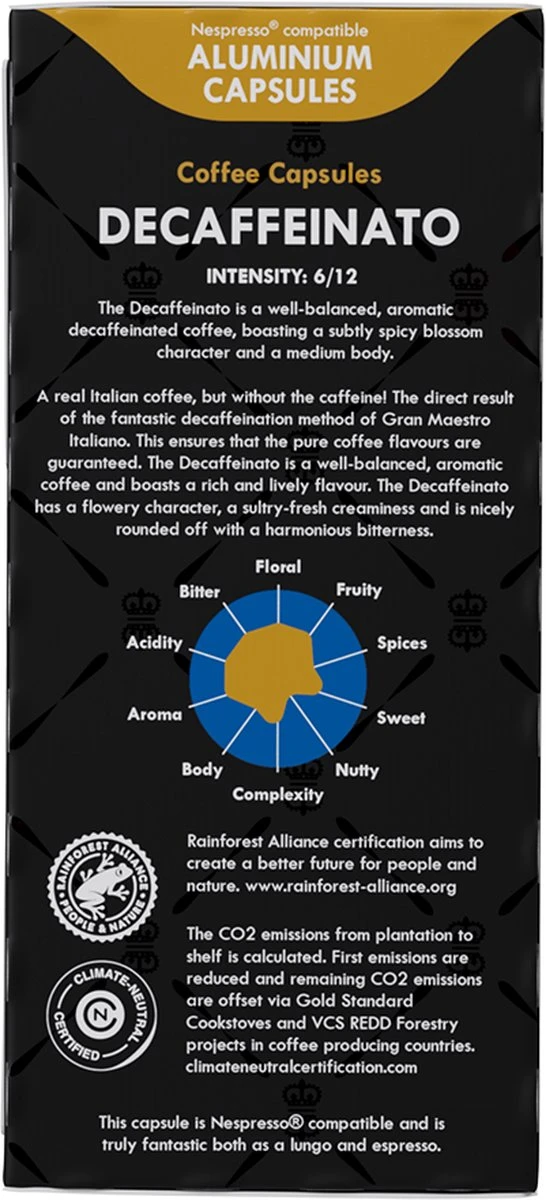 - Decafinato: 20 capsules, Arabica, Decaf, Intensiteit 6 van 12