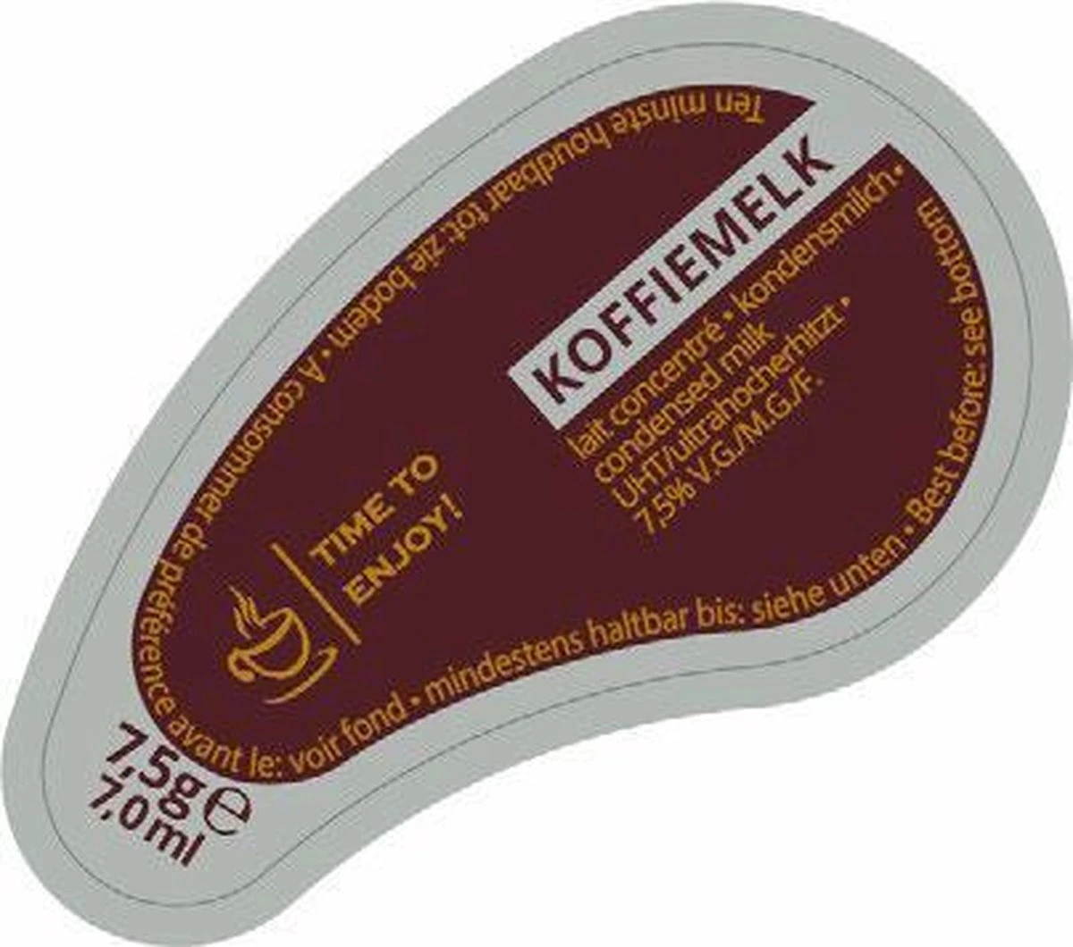 Time to Enjoy koffiemelkcups zijn verpakt per doos met 200 cups van 7,5 gram koffiemelk. 1 koffiemelkcupje is precies goed voor 1 kopje koffie. 7,5% vet.
